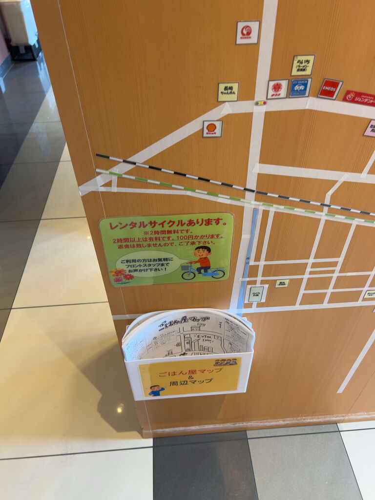 レンタサイクル2時間無料。周辺マップも置かれていた。