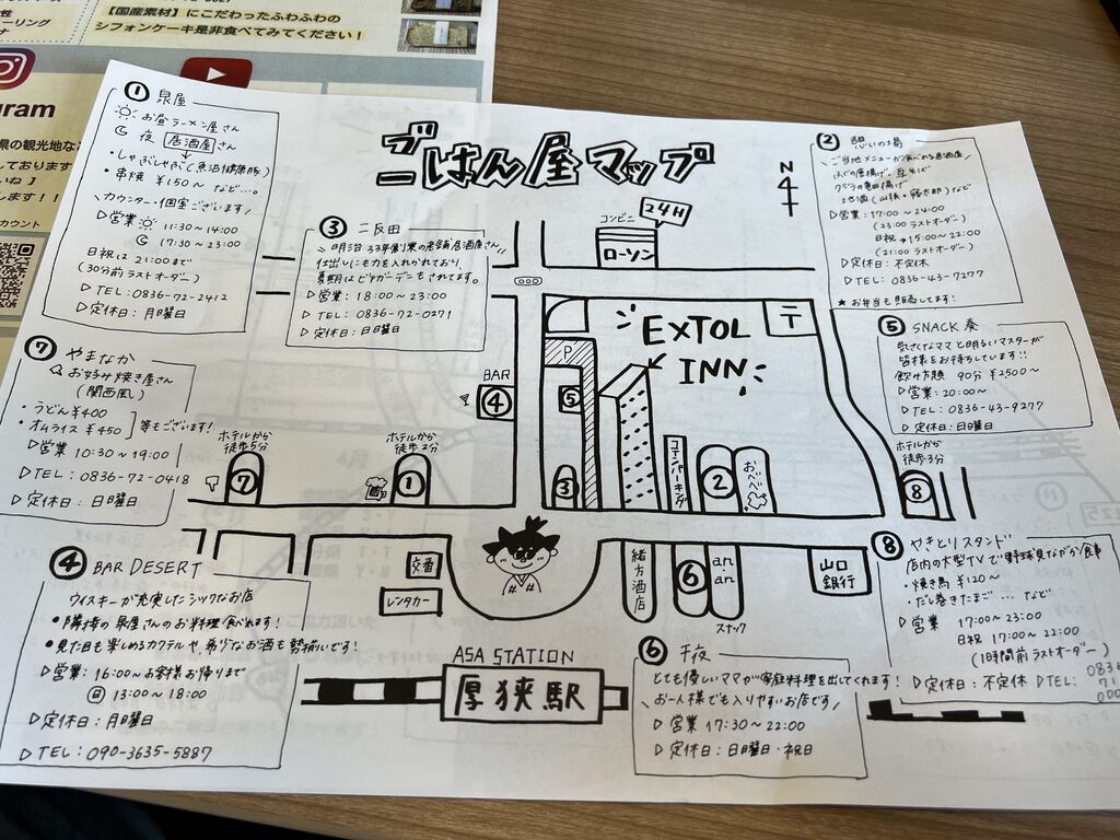 山口県山陽小野田市のサウナ付ホテル「エクストールイン山陽小野田厚狭駅前」に宿泊。ここではホテルの周辺マップを紹介します。