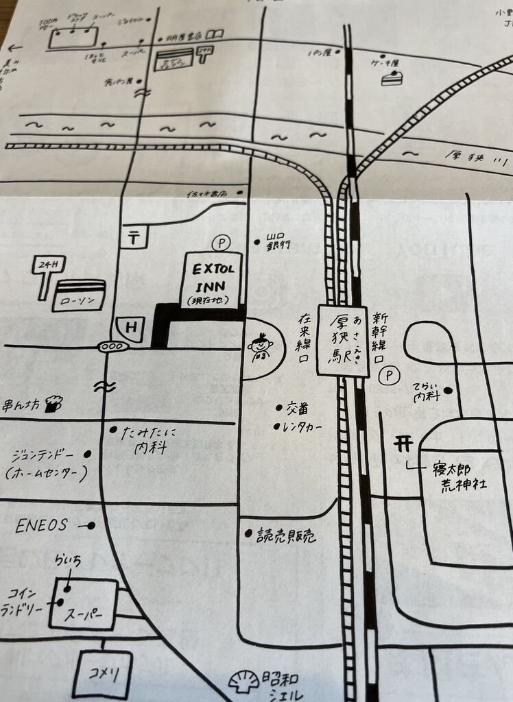 駅周辺は閑散としていたけど、周辺マップをみるとホテルの周りに結構店舗があることに気づく。このマップを見るまでローソンがホテルの近くにあったことも知らなかった・・。